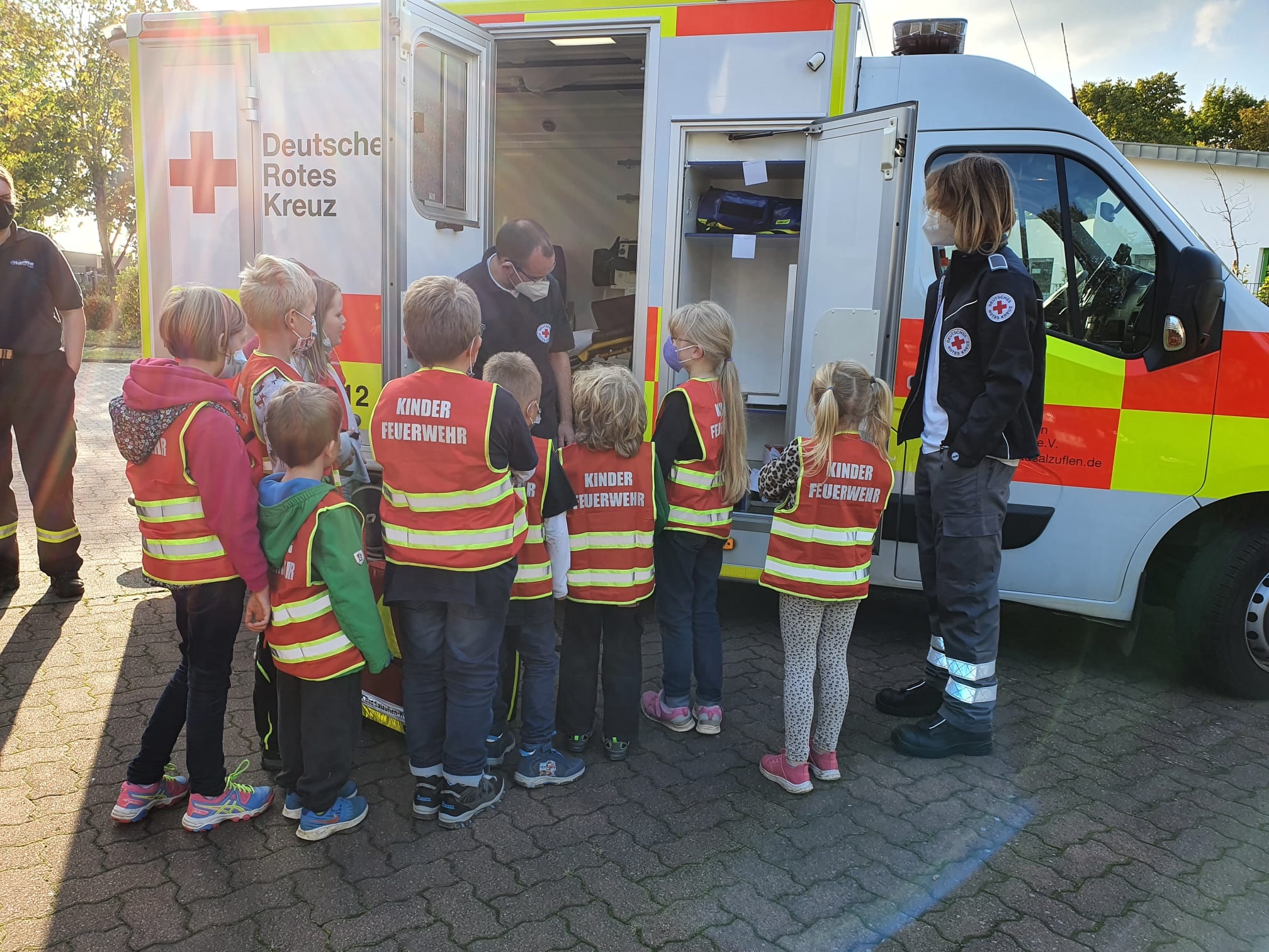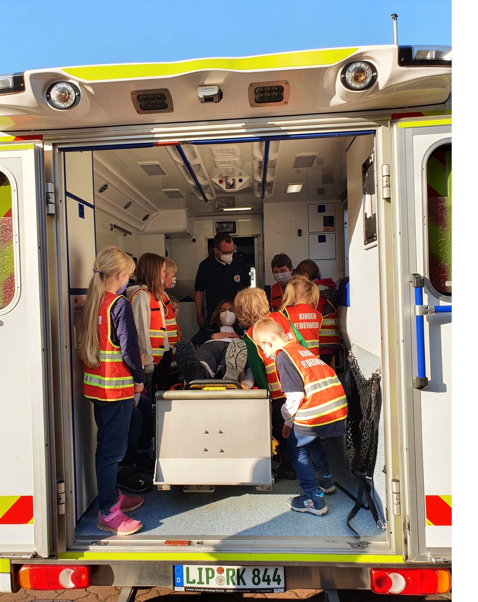 Am Freitag besuchten zwei unserer Helfer den Dienstabend der Kinderfeuerwehr Bad Salzuflen, um einen Krankenwagen vorzustellen und einfache Erste-Hilfe-Maßnahmen zu vermitteln.